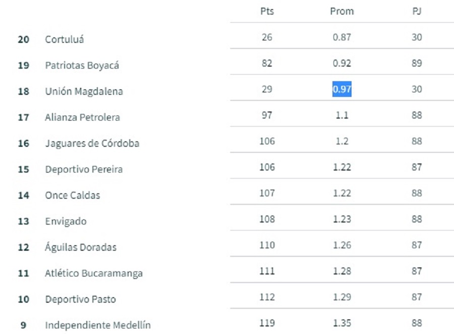 Contra Cortuluá se medirá en el estadio 12 de Octubre, partido clave para empezar a distanciarse de la Segunda Categoría del balompié local. El promedio de los samarios, que ocupan la casilla 18, es de 0.97, mientras el conjunto vallecaucano ostenta uno de 0.87. En cuanto a Patriotas, que el viernes 9 de septiembre abrió la fecha 11 igualando en casa 1-1 con Tolima, resultado favorable para los de Unión, reporta un promedio de 0.92.