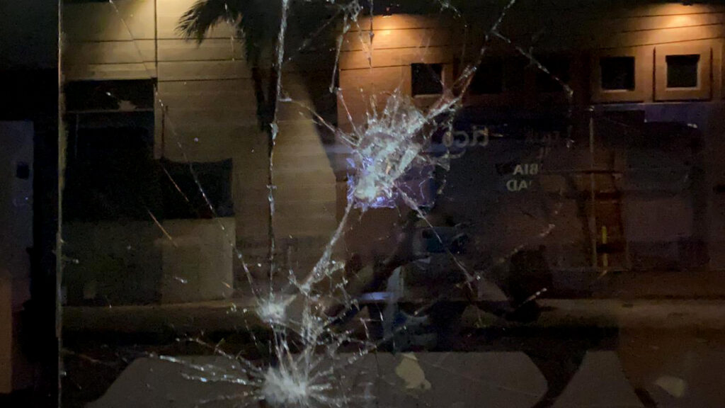Los vándalos rompieron los vidrios de las ventanas de la sede bancaria y escribieron consignas en las paredes y calles del lugar.