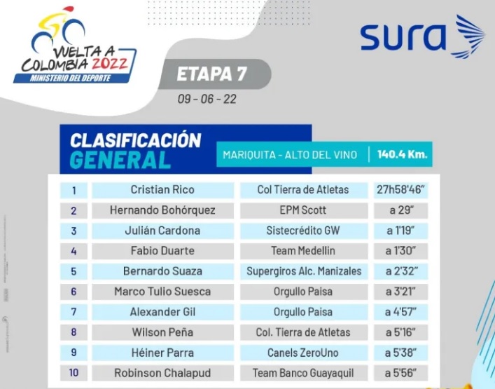 Por otro lado, el corredor sub-23 del equipo Colombia Tierra de Atletas GW Shimano, Cristian Rico, tuvo un buen desempeño y logró mantener el liderato, tras recuperarse en el cierre del parcial de la válida corrida este jueves 10 de junio. El boyacense llegará líder a falta de tres etapas con solo 29 segundos de ventaja sobre Hernando Bohórquez (EPM-Scott GO RIGO GO), segundo en la general.