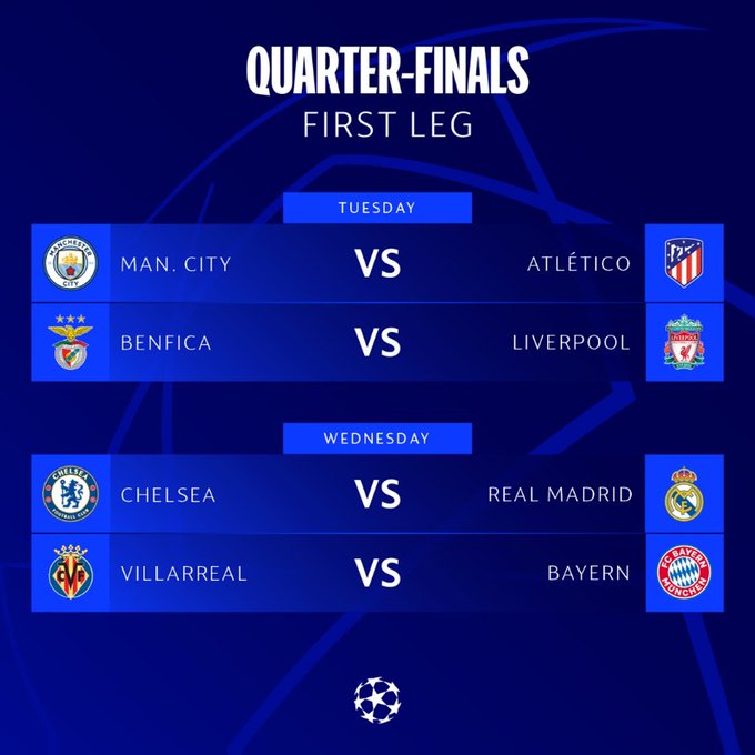 Los otros dos cotejos en esta instancia se darán el miércoles 6 de abril, desde las 2:00 de la tarde: el primero, el de alquilar balcones que estará en Stamford Bridge, Chelsea recibiendo a Real Madrid.